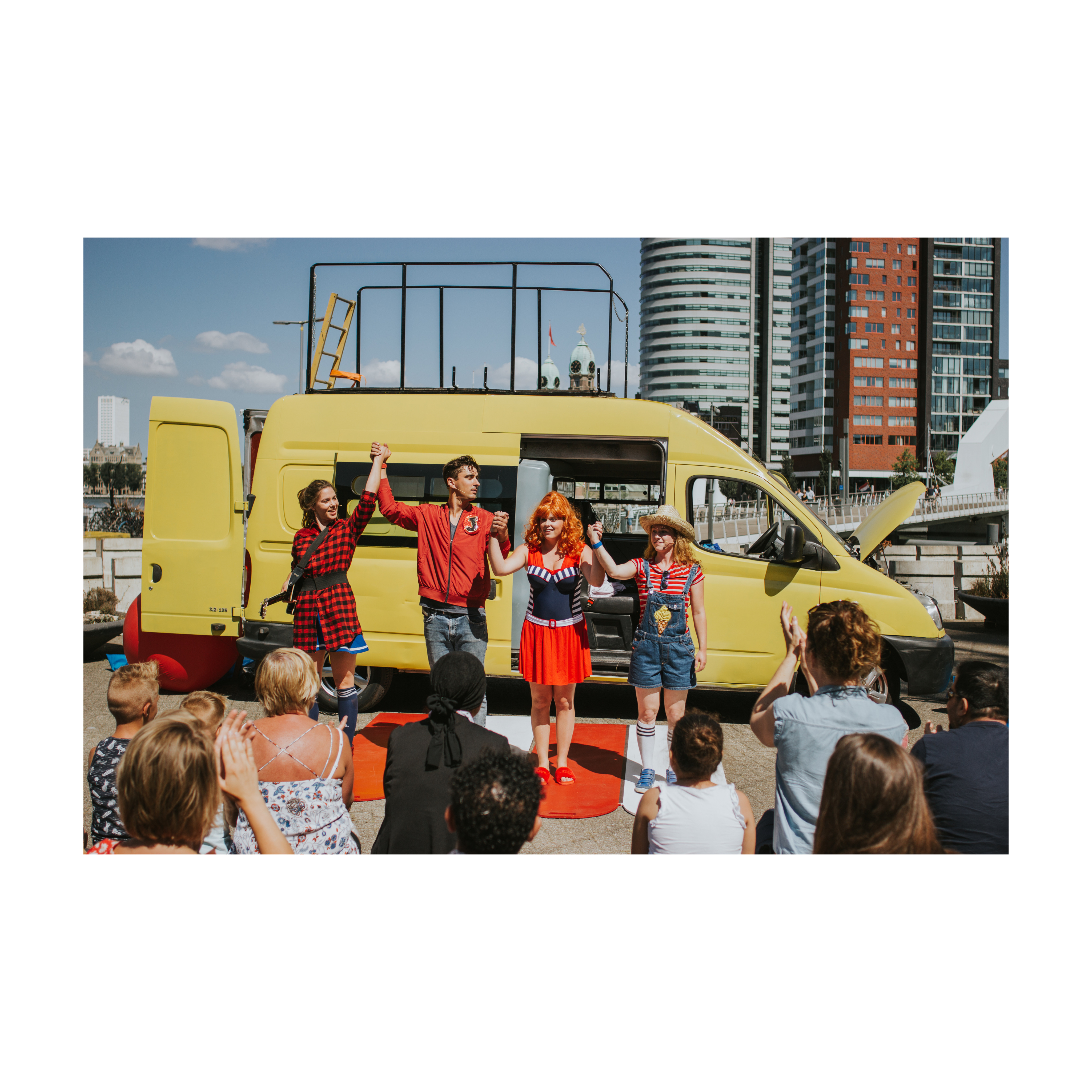 Door middel van een crowdfunding konden we een bus aanschaffen. We schilderden de grijze bus felgeel en tourden met onze voorstellingen door het hele land. Van een klaslokaal tot aan een plein in de stad, oude kloosters of een weiland we stonden overal!