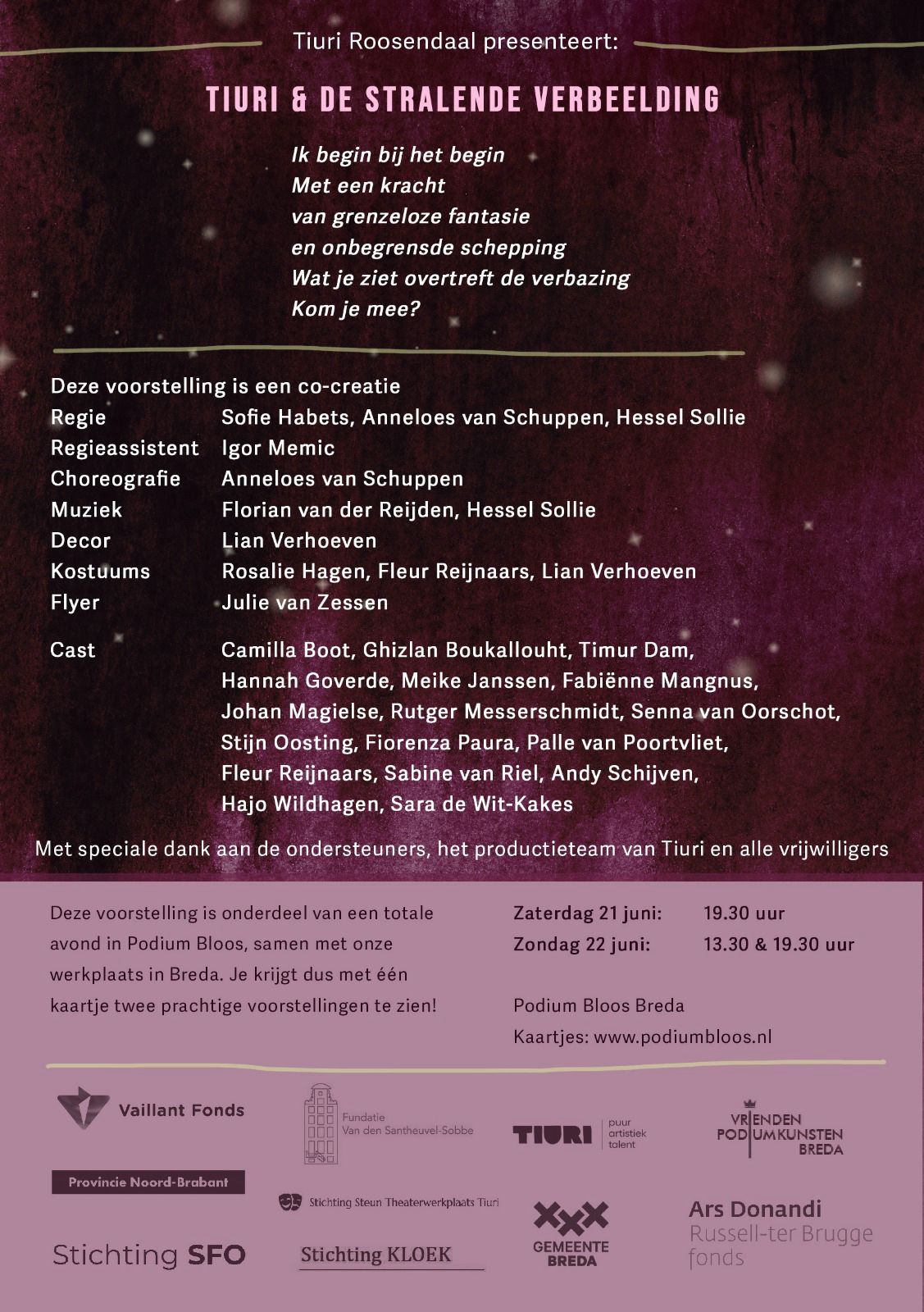 Vorig jaar ben ik in de werkplaats van Tiuri begonnen als theatermaker. In de werkplaats krijgen spelers, afkomstig van het speciaal onderwijs, de kans om hun talent voor theater en/of dans verder te ontwikkelen. Dit gebeurt in een veilige omgeving in Breda en Roosendaal, waar zij vijf dagen per week les krijgen van een team van professioneel geschoolde docenten en makers. De werkplaats vormt het fundament van de organisatie, waar spelers hun eigen kracht op het podium ontdekken.